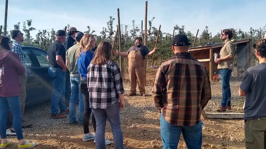Head Cidermaker Nate Lambert, facing a throng of students, gestures in all directions at the orchards “just down the road” who contribute to the creation and craft of their artisanal beverages. Rows of heritage apples line today’s classroom as we listen to him talk, describing the delicate process of avoiding pests, blights, and other hazards, the challenges of finding harvesting labor, and how to tell when it’s the ideal moment to pluck the fruit from the tree, bursting with the right stuff to create the perfect cider.