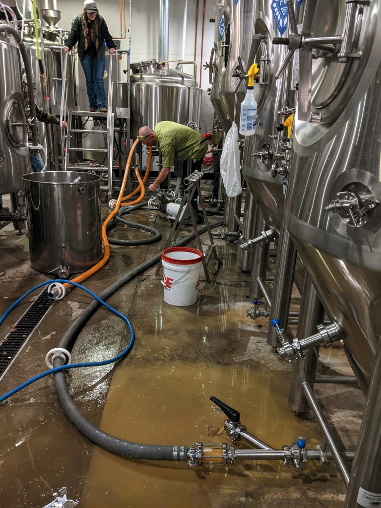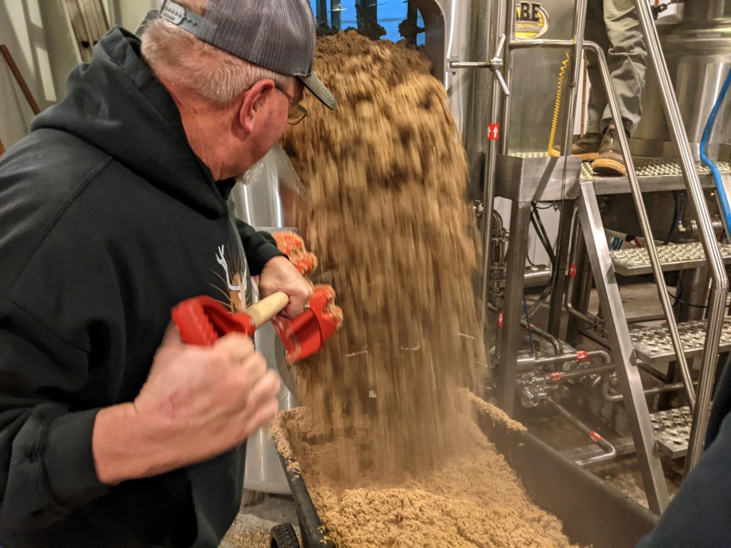 Not all of the brewing process is making beer. A lot of the labor also includes cleaning and discarding used ingredients. Joe, a brewing student at CWU, helpfully shovels the spent grain from the mash tun. He volunteered to take the donated grains back to his farm where he can use it as chicken feed, one of the many uses for leftover brewing material, and another great way the community can come together to help each other out.