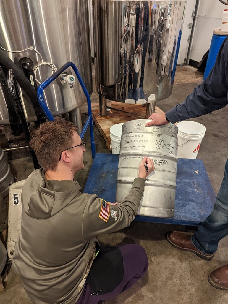 After hours of tireless labor (and a lot of visiting) our Red, White & Brew IPA is fermenting away and we’re ready to call it a day. Members of our veteran community triumphantly sign and raise a keg to mark the moment. The keg can still be found at Ellensburg Brewing Company to this day.