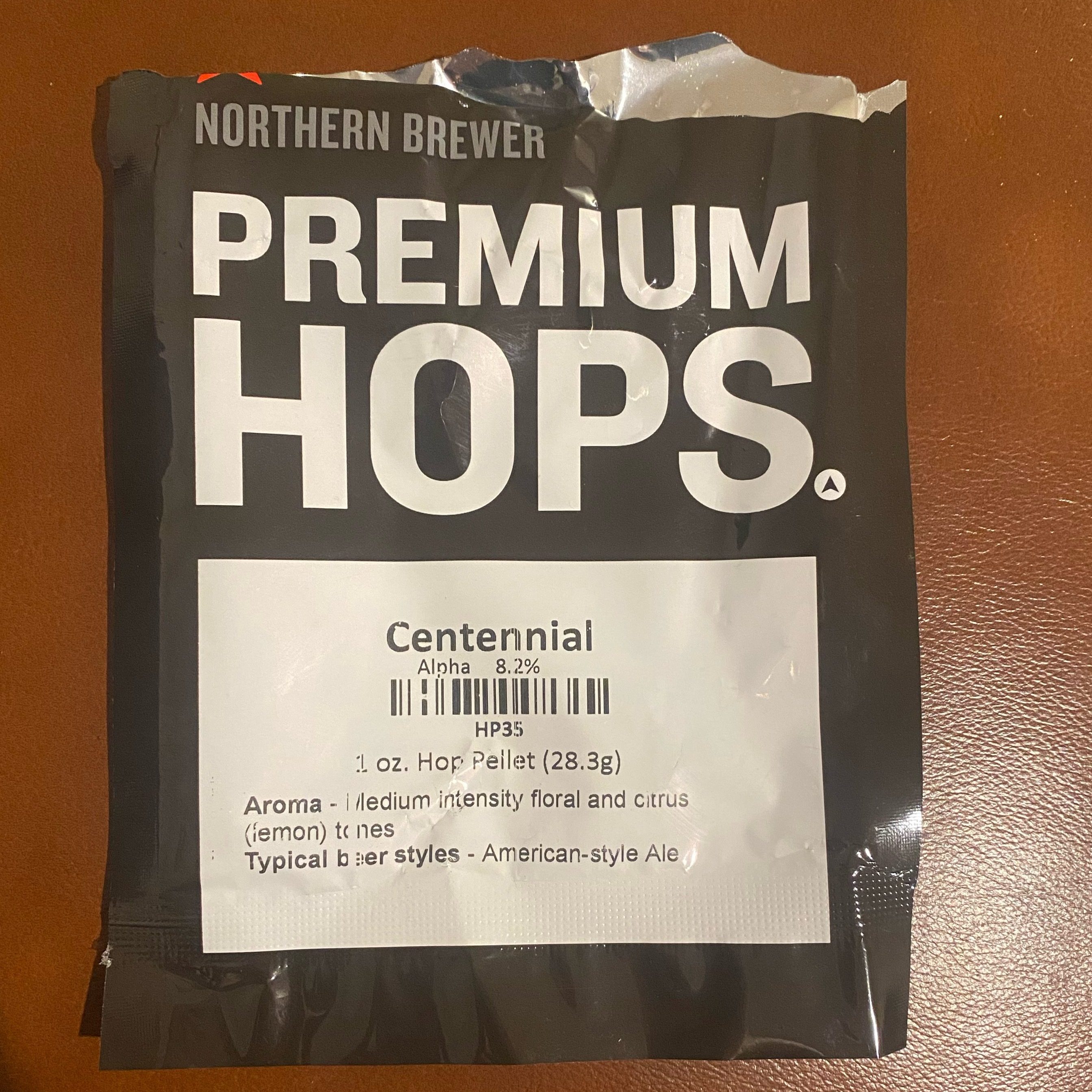 I boiled the wort for 45 minutes starting with my first addition of my Centennial Hops with an alpha of 8.2%, and the packet was a total of 28.3 g of hops.