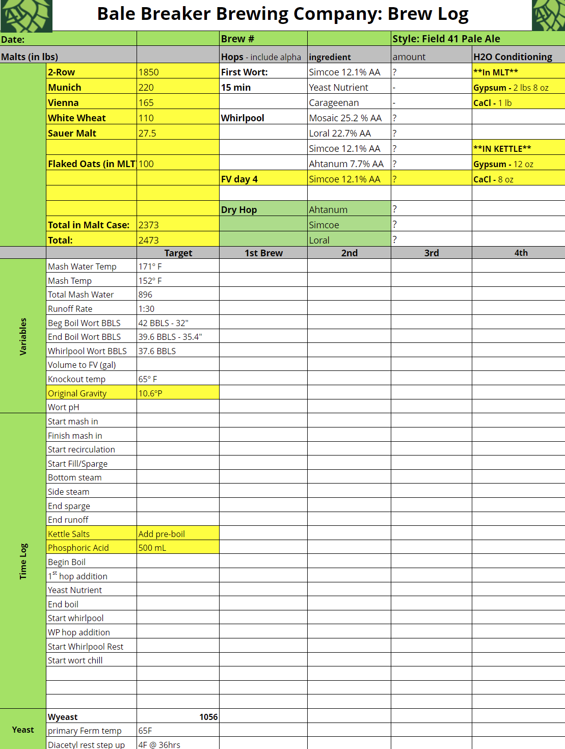 I was originally planning on using sensory analysis to reverse engineer the recipe for Field 41, a task that would’ve been time consuming and far too extensive for the scope of a single, 10 week school quarter, so instead I decided to reach out to the source, Brian Logan, the Production and Quality Manager at Bale Breaker Brewing Company. One of the massive benefits of being a student in the brewing program at CWU is being able to have access to members of the craft brewing community, and pick their brains and dive into their expertise.