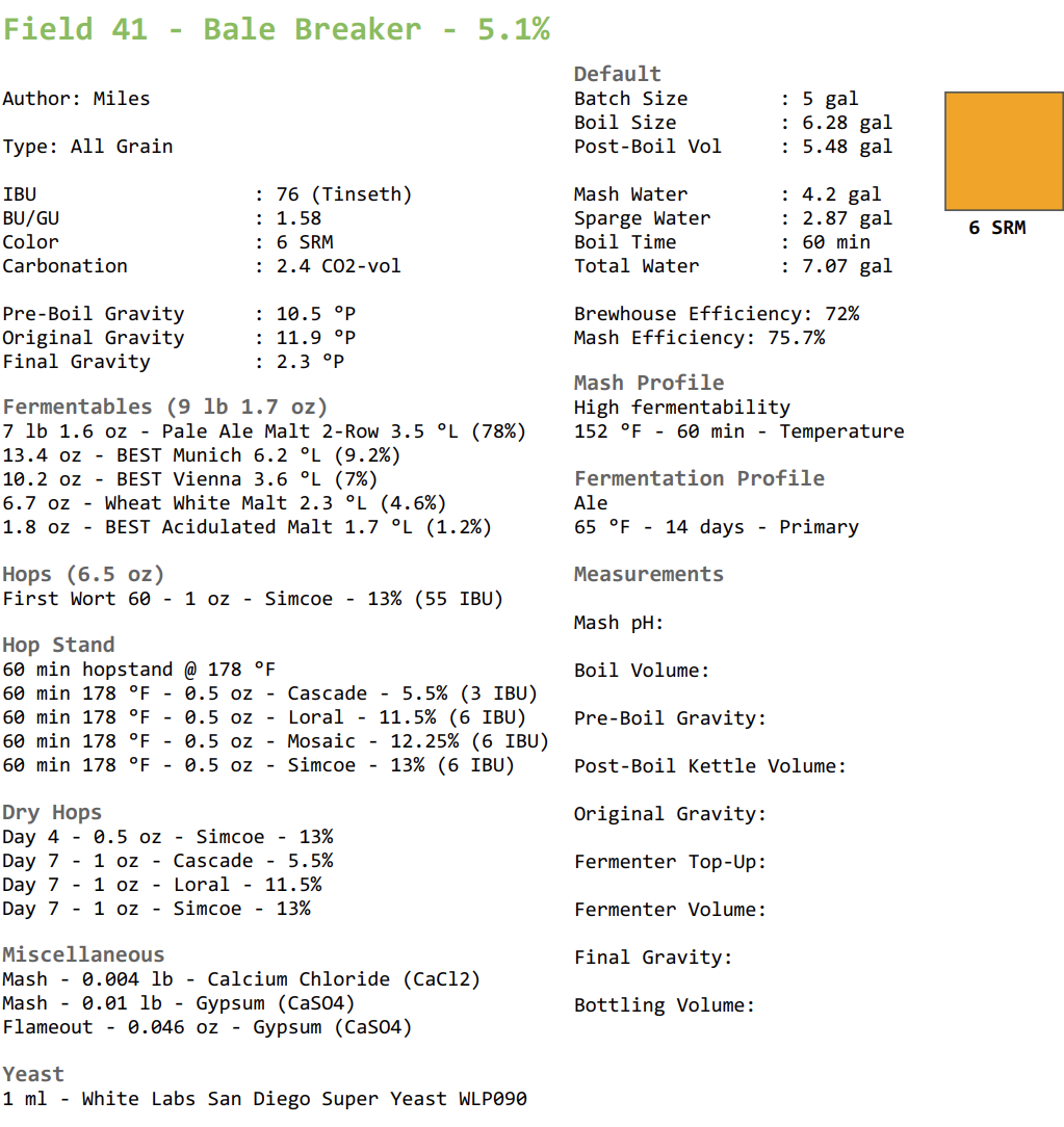 I’d done some digging and was able to find the bones of the Field 41 recipe, but just like when baking a cake, knowing the ingredients is only a small part of the battle. I still wasn’t sure about quantities, mashing profile, the use of protein rests, or quantities of hops and when they’re added, fermentation temperature, gravity targets, or dry hopping, just to name a few. This is where Brian Logan donated his valuable time and allowed me to see the recipe they use at Bale Breaker, a resource that I’m still thankful to have. Myself from 10 years ago is so jealous right now.