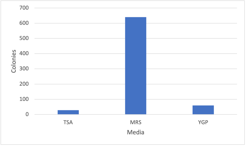 All samples had growth on TSA, but the only samples that had growth on MRS and YGP were from the GTs Pure kombucha. All dilutions of the GTs kombucha had similar proportions of growth across the media, so I’ve only included a graph for the 1:100 dilution. The media that grew the most colonies was MRS, showing that there was a high amount of lactic acid bacteria present in the sample (Figure 1). The growth on YGP shows that yeast was able to grow, and the growth on TSA shows that acetic acid bacteria were able to grow.