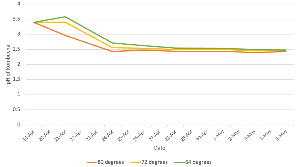 To do this, I kept three jars of sweet tea mixtures at different temperatures (64°F, 72°F, and 80°F) all of which had been inoculated with GTs Pure kombucha. These samples grew for 16 days, and over that time pH measurements were taken three times a week. Three sets of 50 mL samples were taken from each condition, one on April 26, May 5, and May 8.