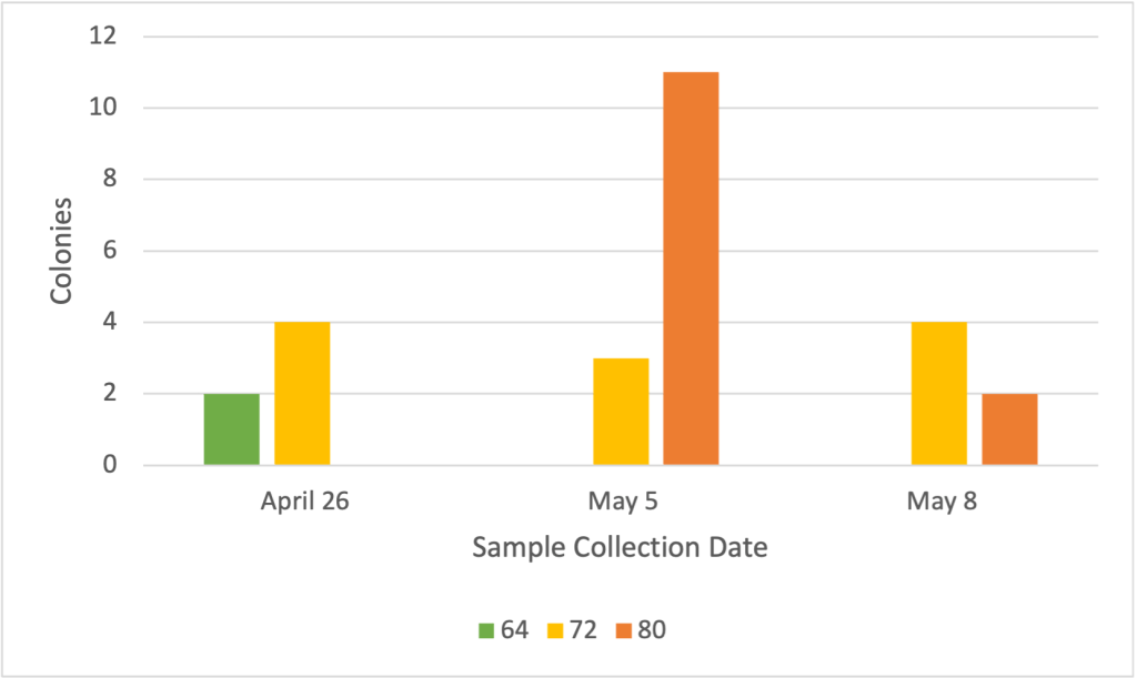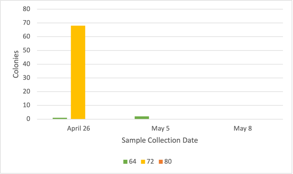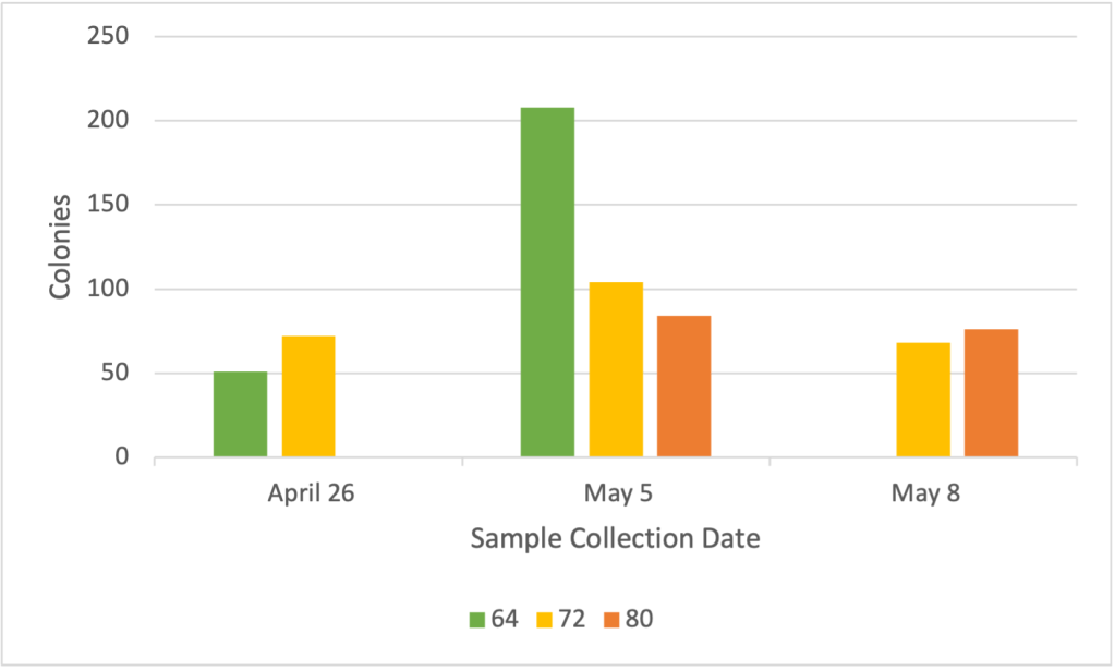 For the microbiological tests, we performed a serial dilution on the original GTs kombucha, as well as each of the samples we had. We plated dilution ratios of 1:1, 1:10, 1:100, and 1:1000 on TSA, MRS, and YGP media. During the transportation of these samples, two were dropped, so we don’t have data for the 80°F sample from April 26 and the 64°F sample from May 8.