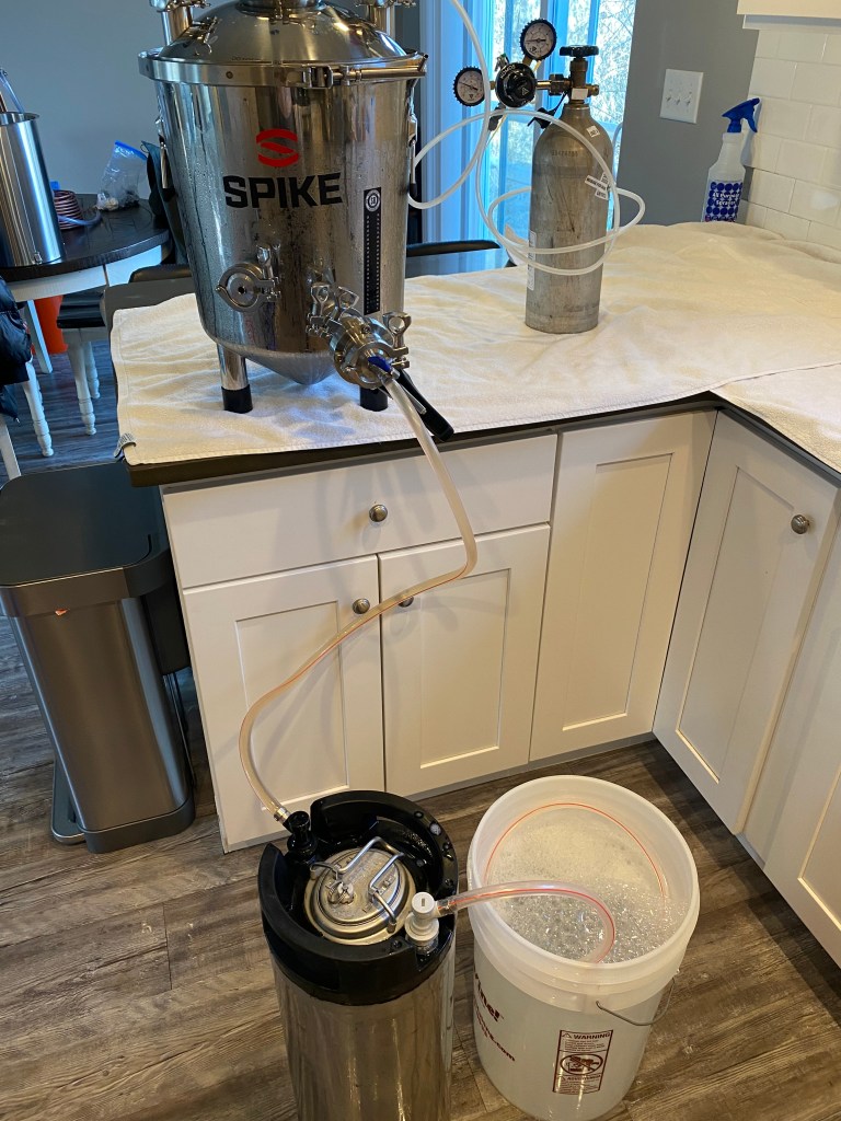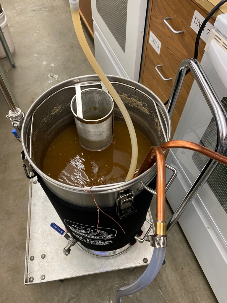 After the mash out was complete, I began the cooling process. To do so I recirculated the hot wort through a pipe that passes by a pipe that is having cold water circulating through it. Therefore, cooling the wort quickly through heat exchange. Once the wort was cooled to about 80 degrees, I was able to pitch the yeast and exchange the wort to the anvil fermenter. The fermenter was then hooked up the glycol chiller. This is to help regulate the temperature of the brew keeping it at 52 degrees where it will ferment for 27 days.